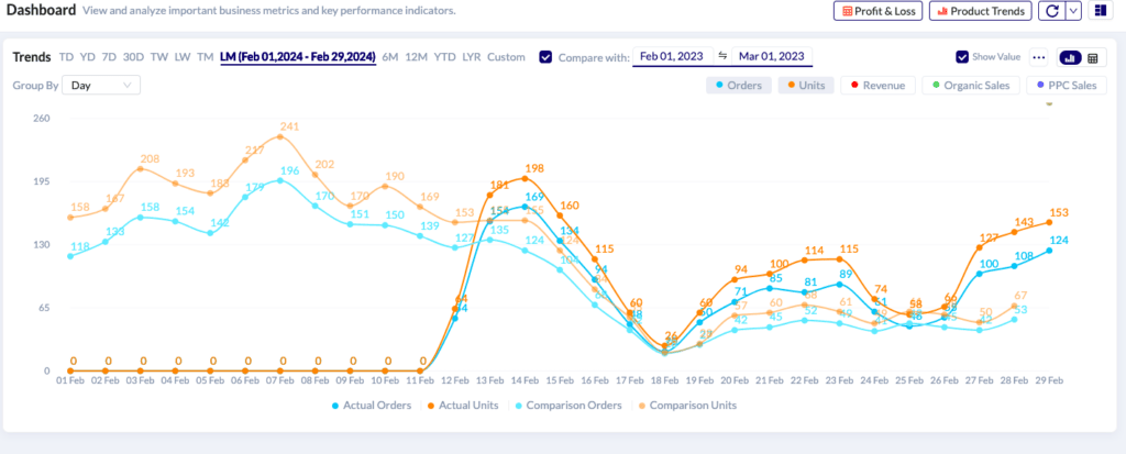 - Comparison and Correlation: Sellers can compare and correlate the data on orders, units, and revenue to understand their relationship. For example, they can analyze whether an increase in orders directly correlates with higher revenue or if changes in units sold impact overall revenue.