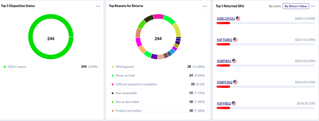 - Top Returned SKUs: Sellers can pinpoint frequently returned products and their values, aiding in identifying areas for improvement in quality, description accuracy, or packaging.